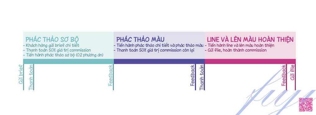 1. Khách hàng gửi brief chi tiết cho người vẽ (khuyến khích các bạn gửi brief càng chi tiết càng tốt để tiết kiệm thời gian làm việc của đôi bên)2. Sau khi trao đổi để nắm được các thông tin cần thiết và báo giá, khách hàng xác nhận đặt comm vui lòng thanh toán trước 50% giá trị commission.3. Trong vòng 48 tiếng kể từ tin nhắn khách hàng xác nhận đặt commission, nếu khách hàng chưa thanh toán và không có thông báo cụ thể, commission sẽ tự động bị huỷ.4. Sau khi nhận được thanh toán như yêu cầu, người vẽ bắt đầu quy trình phác thảo.5. Ở giai đoạn phác thảo, khách hàng có thể có 02 phương án để lựa chọn, khách có thể đề xuất hoặc để người vẽ tự phát triển dựa trên brief đã gửi. Nếu brief đã có yêu cầu phương án bố cục cụ thể thì người vẽ có thể phác luôn phương án đó và làm phác thảo màu.Lưu ý: Ở giai đoạn này, bản vẽ có thể rối hoặc chưa chau chuốt mục đích chính là để khách có thể hình dung cơ bản bố cục tranh. Ở giai đoạn này khách có 02 lần sửa miễn phí với bố cục tranh đã chọn. Từ lần sửa thứ 03 sẽ tính từ 5-10% baseprice.6. Sau khi chốt phác thảo sơ bộ, người vẽ sẽ tiến hành tinh chỉnh phác thảo và làm phác thảo màu. Ở giai đoạn này khách có 02 lần sửa miễn phí. Từ lần sửa thứ 03 sẽ tính từ 5-10% baseprice.7. Sau khi chốt phác thảo và phác thảo màu, khách vui lòng thanh toán 50% còn lại để người vẽ tiến hành giai đoạn tiếp theo, thời hạn thanh toán là 48 giờ sau khi chốt.8. Sau khi nhận được thanh toán, người vẽ tiến hành lên màu và gửi bản final. Khách hàng có 02 lần sửa miễn phí về màu ở bản final (không sửa bố cục), từ lần sửa thứ 03 trở đi sẽ được tính thêm phí tuỳ theo yêu cầu của khách hàng và thoả thuận với người vẽ (10-20% baseprice)9. Sau khi hoàn thiện tranh, người vẽ gửi 01 file png chất lượng cao và 01 file psd (đã gộp toàn bộ layer) cho khách qua email, giao dịch hoàn tất.