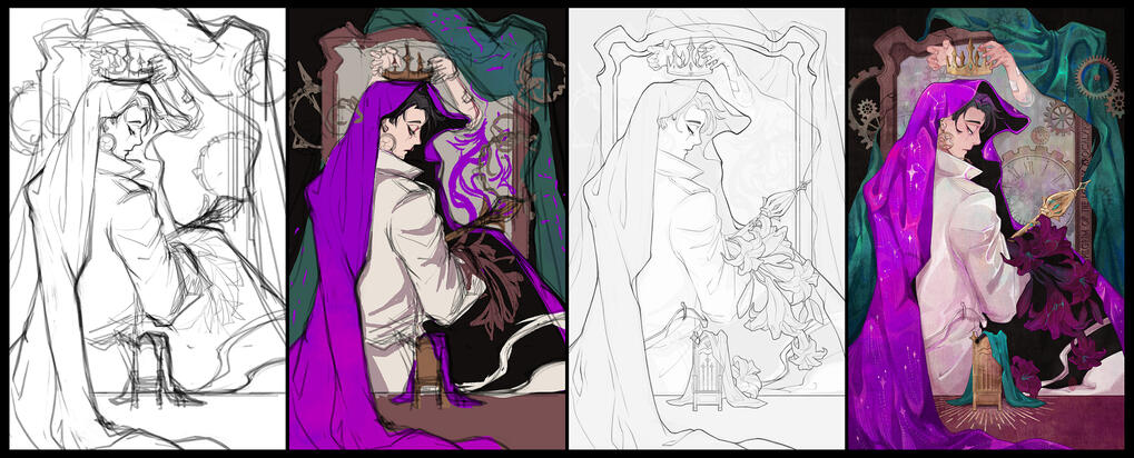 W.I.P cơ bản của 01 commission: Phác thảo - Phác thảo màu - Line - Hoàn Thiện.